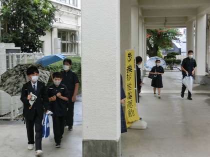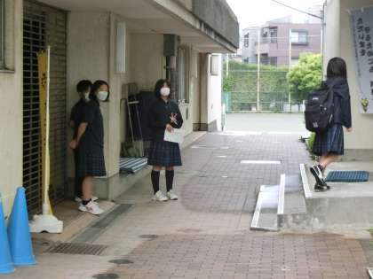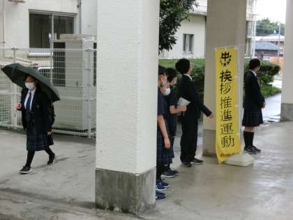 今朝は霧雨が降って肌寒いですが、生徒会役員と放送委員が屋根のある場所で「おはようございます」と朝から元気よくあいさつをしていました。