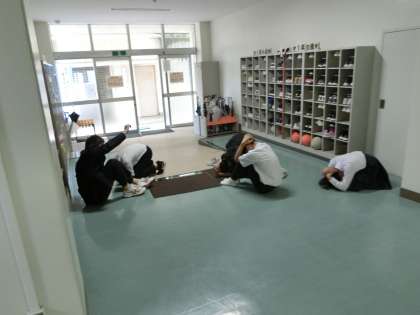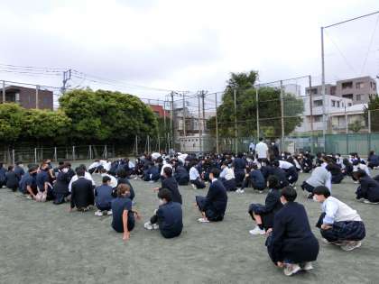 昼休みに大きな地震が発生し、技術室から火災も発生したという設定で、放送の指示で校庭に避難する訓練を行いました。