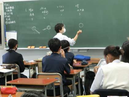 天気の記号の小テストを行い、正解の解説を聞いています。