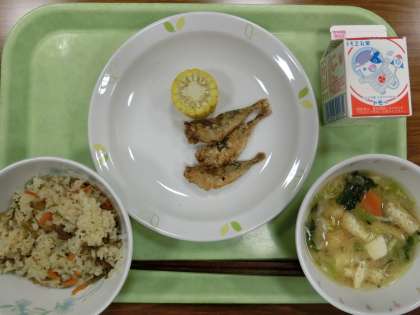きんぴらご飯 ・豆あじの唐揚げ ・ゆでとうもろこし ・大根とねぎの味噌汁 ・牛乳です。