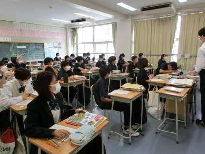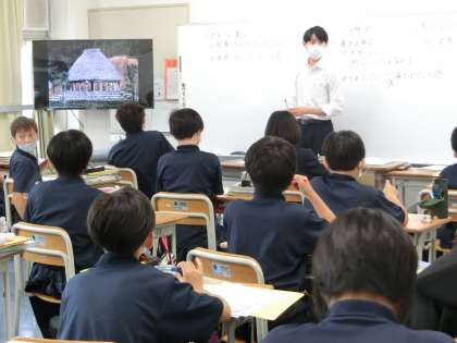 1年生社会科は、サモアの住居について映像を見ながら学習をしています。旅行で行ったとき、沖縄の家もこんな感じだったと発言する生徒も。