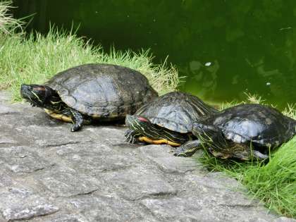 池の亀が3匹並んで、1年生の授業を聞いています。