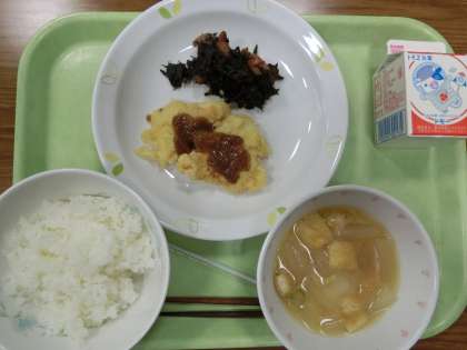 ご飯 ・鶏天の胡麻だれかけ ・ひじきと根菜の土佐煮 ・とうがんと油揚げの味噌汁 ・牛乳 です。