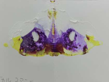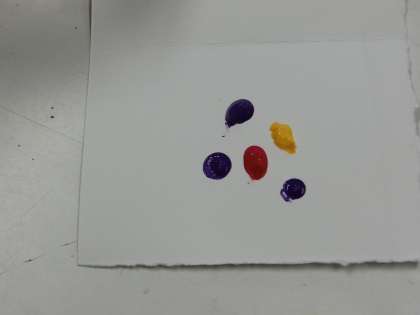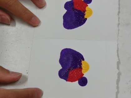 1年生美術は、手で画用紙を4つに切って、1つを半分に折って、片方に好きな絵の具をぽんぽんと置いて、画用紙を折り、上から体重をかけて押すと、様々な模様になりました。