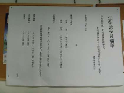生徒会役員選挙の公示が玄関前に掲示されました。 1・2年生の皆さん、次の生徒会役員となって北沢中のために頑張ってみませんか?