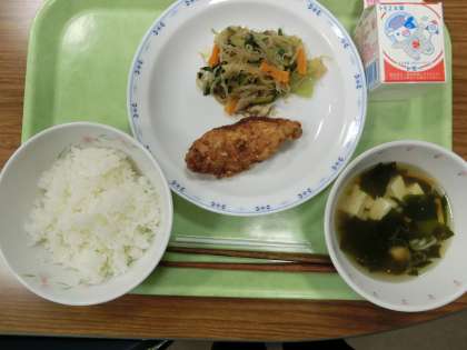 ご飯 ・油淋鶏 ・炒合菜 ・わかめスープ ・牛乳 です。