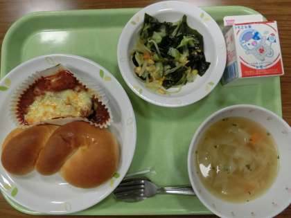 ミルクパン ・ナスとポテトのミートグラタン ・海藻サラダ ・野菜スープ ・牛乳 です。