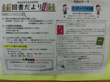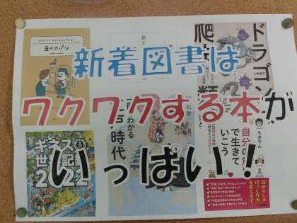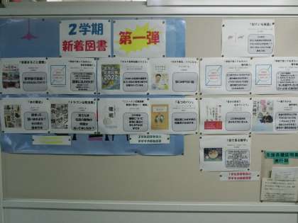 事務室の前に新刊本の紹介がされています。これを見たら、図書室へGO!