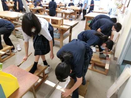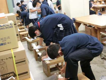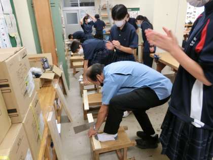 その後、実際に切っていますが、生まれて初めてのこぎりで木を切る生徒も。素敵な台が出来そうです。楽しみですね。