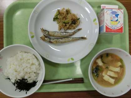 麦ご飯 ・ししゃもの唐揚げカレー風味 ・切干のごま和え ・ひじきふりかけ ・生揚げと大根のみそ汁 ・牛乳です。