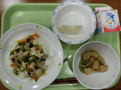 今日は重陽の節句。菊の餡掛けご飯 ・里芋といんげんの胡麻かけ ・梨 ・牛乳です。