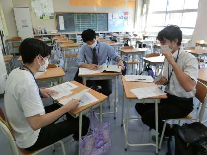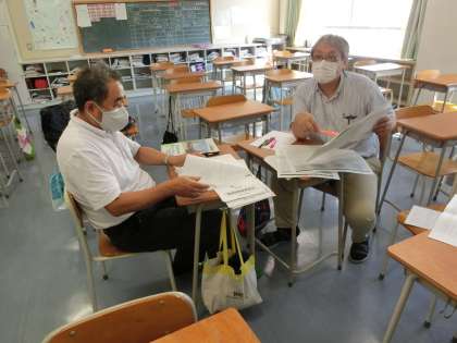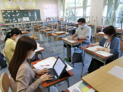 「北斗の学び舎」の下北沢小学校の先生と北沢中学校の5教科の先生が、4月に行った区の学習習得確認調査の結果をもとに、学び舎で連携して、どんな点を重点的に指導していくかなどを話し合っています。