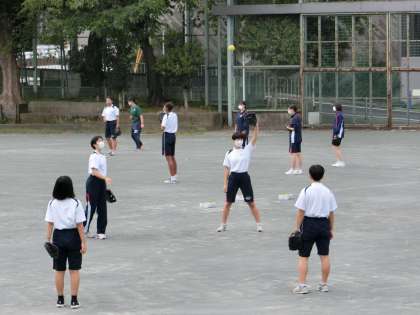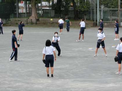 校庭で4グループに分かれて、丸くなって、ソフトボールのキャッチボールを行っています。