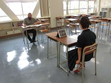 ALTのステイーブン先生の前で、教科書の本文を読み、ステイーブン先生の質問に英語で答えるテストを一人ずつ行っています。