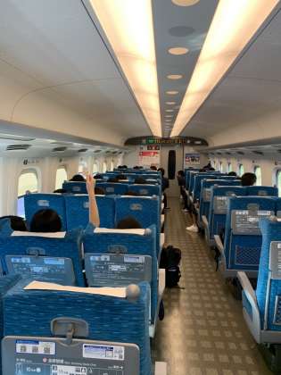 新幹線に乗りました。車内ではトランプをしたり、お話をしたりして楽しんでいます。