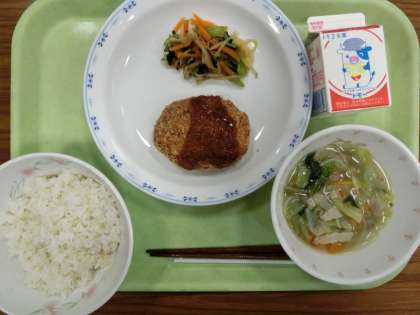 麦ご飯 ・パンプキンコロッケ ・小松菜の和え物 ・野菜とベーコンのさっぱり煮 ・牛乳です。