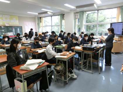 2年生英語は、教室では英文を先生のあとについて読んでいます。