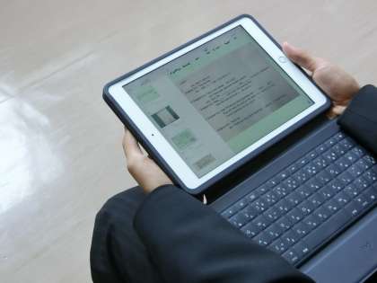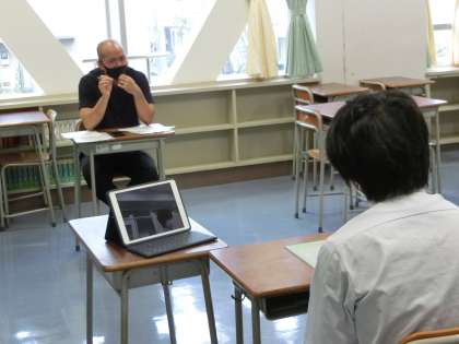 隣のクラスでは、ALTのステイーブン先生の前で、ipadに入った英文を読んで、質問に答えるテストを行っています。次の生徒は、廊下でipadを見ながら練習しています。