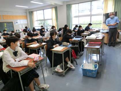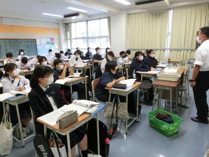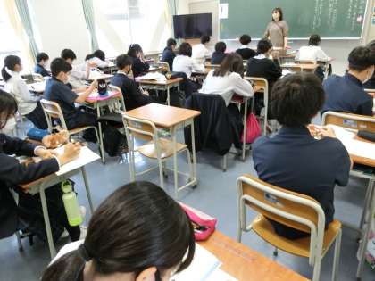 数学は、速さの計算問題の解説を真剣に聞いています。