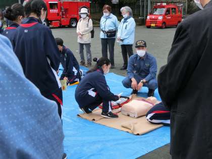 地域の方と一緒に、AEDの使い方や人工呼吸の仕方。三角布の付け方。煙中訓練や消火器の使い方など体験しています。