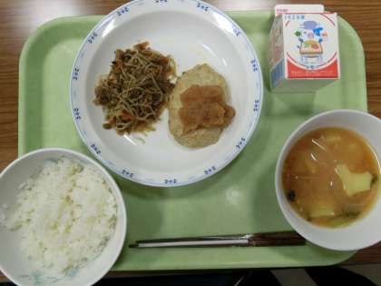 ご飯 ・和風ハンバーグ おろしソース ・白滝のきんぴら ・みそ汁 ・牛乳です。