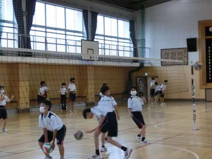 1年生男子体育は、バレーボールのスパイクの練習をしています。