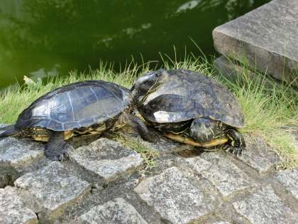 仲良しの右の亀子と左の亀男が、池から出て、日向ぼっこしています。