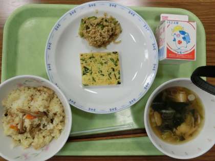 ふきよせご飯 ・千草焼き ・切干ときゅうりのごま酢和え ・大根と小松菜のみそ汁 ・牛乳です。