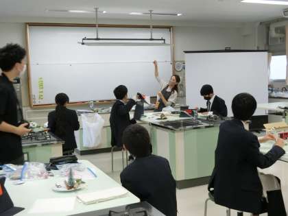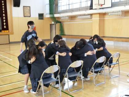 5・6時間目2年生は、感染症予防のため、お店等で職場体験が出来ないので、5つの職種の方々に来ていただき、グループに分かれて、気象予報士・介護士・フードコーデイネーター・アナウンサー・システムエンジニアの方々から、お話を聞いて、実際に体験しています。