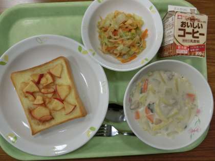 アップルトースト ・フレークサラダ ・マカロニのクリーム煮 ・コーヒー牛乳せづ。