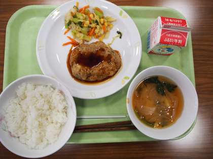 期末考査最終日の給食は、ご飯、れんこんバーグ、キャベツとコーンのごまドレサラダ、みそ汁です。