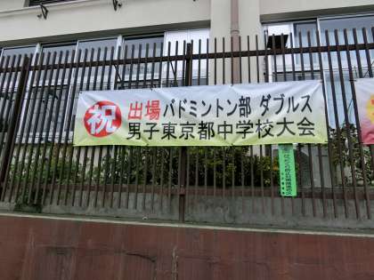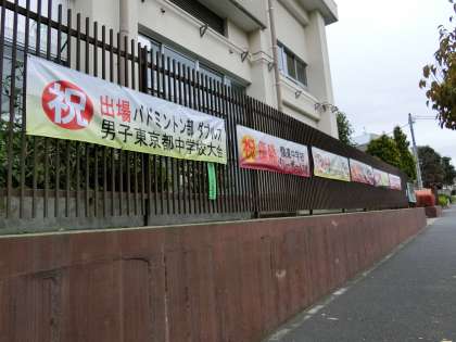 今回は、男子バトミントン部が都大会出場の垂れ幕をPTAに作って頂き、正門横に掲示しました。これで6枚目になりました。学校にいらしたときにご覧ください。いつもありがとうございます。