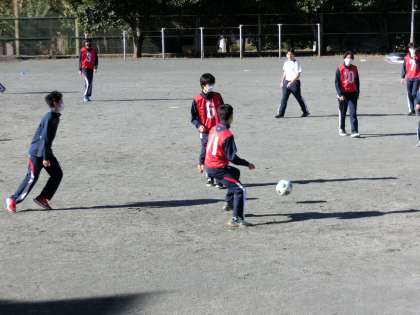 3年生男子体育は、真っ青な空の下の校庭でサッカーの試合を行っています。