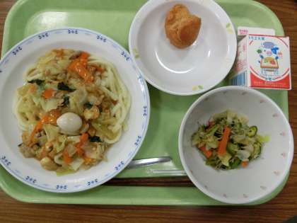 五目あんかけうどん ・じゃこサラダ ・ごまドーナツ ・牛乳です。