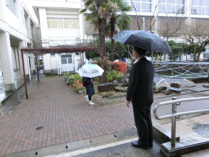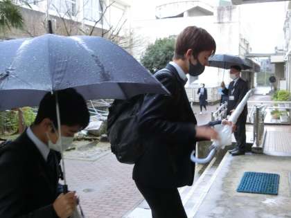 今朝はかなり雨が降っていましたが、校長先生は玄関で、生徒に「おはよう」「あと1分」と声をかけて下さっています。急ぎながらも、生徒たちも「おはようございます」を返して、教室に。今日も始まりました。