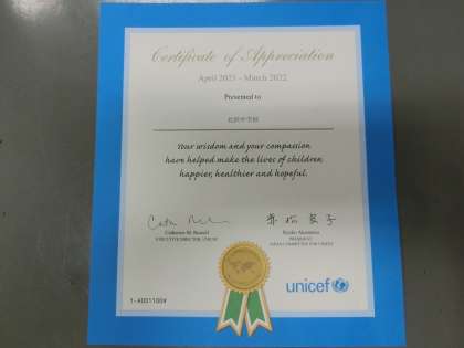 ユニセフから感謝状を頂きました