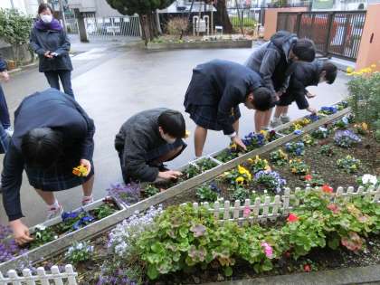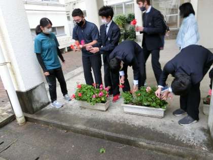 小雨が降って来ましたが、昼休みに学校支援本部の皆様の指導のもと、2・3年生の有志が沢山集まって、しおれた花や枯れた枝などの取り方を教わり、実際に取り除きました。
