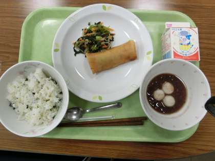 わかめご飯 ・めかじきの包み揚げ ・おかか和え ・白玉ぜんざい ・牛乳です。