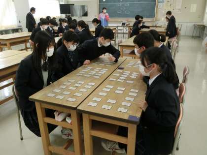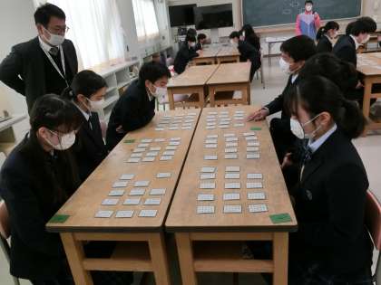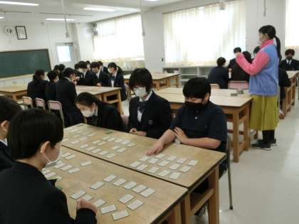小倉百人一首を源平戦で行っています。担任の先生が読み札を読んで。