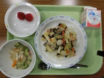 中華丼 ・春雨サラダ ・いちご ・牛乳です。