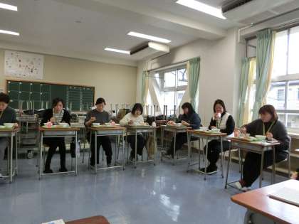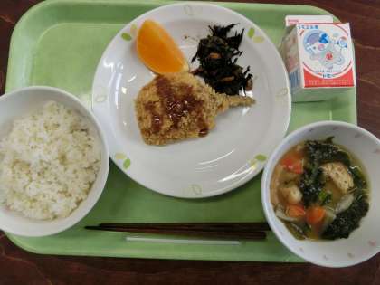 最初の35分間、栄養教諭から給食についての説明の後、実際に配膳もしていただき、今日のメニューは麦ごはん ・あじフライ ・具だくさん味噌汁 ・いそ煮 ・夢オレンジ ・牛乳でした。