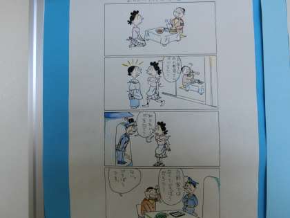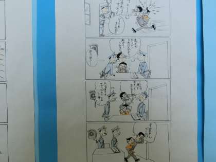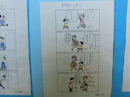 廊下にサザエさんの4コマ漫画の防犯について、各自が作成した作品が展示されています。