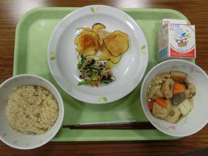 茶飯 ・おでん ・ごま和え ・野菜チップス ・牛乳です。