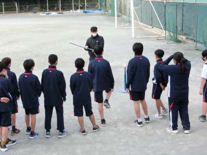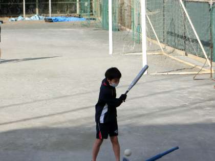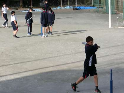 土曜授業日なので、校庭では、1年生男子体育がソフトボールの打撃の練習をしています。先生の話を真剣に聞いて、6グループに分かれて、1人ずつ1球打ったら交代で。なかなか難しいようですが、集中して打っています。