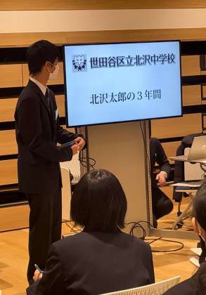 世田谷区内の生徒会が集まり各校の活動を紹介する生徒会サミットが開かれました。10月より作成を続けた北沢中学校の紹介動画と北沢中の魅力について、本校の生徒会役員2名が代表して発表をしました。