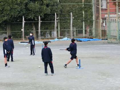 1年生男子体育ソフトボールの打撃練習2回目。前回と同じ6チームに分かれて、打つ練習をしていますが、なかなかボールにあたらず、下の棒を打ったり、悪戦苦闘しています。よくボールを見て、頑張れ〜!
