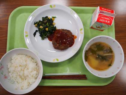 本日の給食は麦ごはん、ヘルシーハンバーグ、ほうれん草とコーンのソテー、わかめと根菜の汁物です。