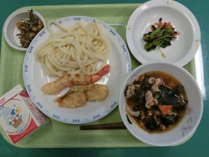 わかめうどん・天ぷら2種・小松菜の磯和え・大豆と田作りのカリカリ・牛乳です。