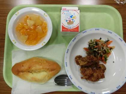 ガーリックトースト・鶏肉のから揚げ・ナムル・フルーツポンチ・牛乳です。
