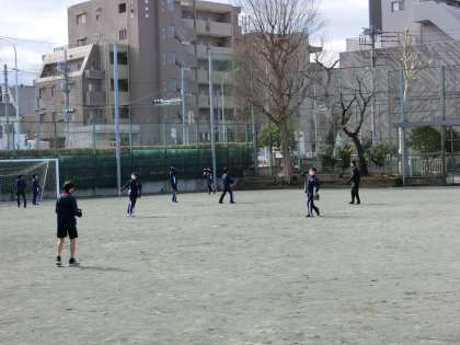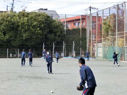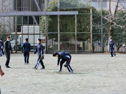 2年生男子体育は、校庭でソフトボールのゴロをとる練習を2人1組で行っています。